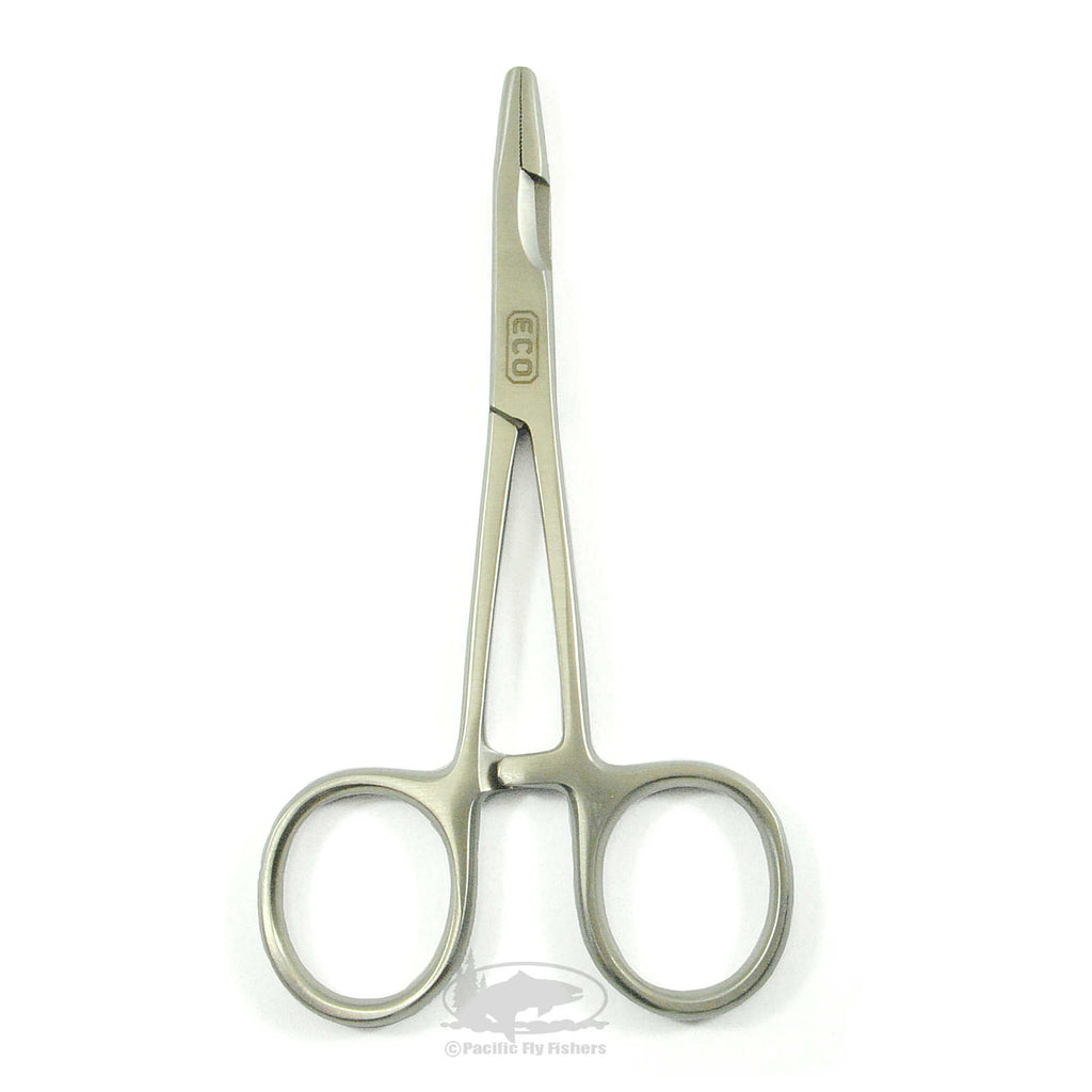 The 5.5-inch Eco Scissor Clamp is a standard sized forcep with jaws that are serrated for holding flies better, but with a flat tip for crushing barbs. Color is a satin finish, silver stainless steel.
